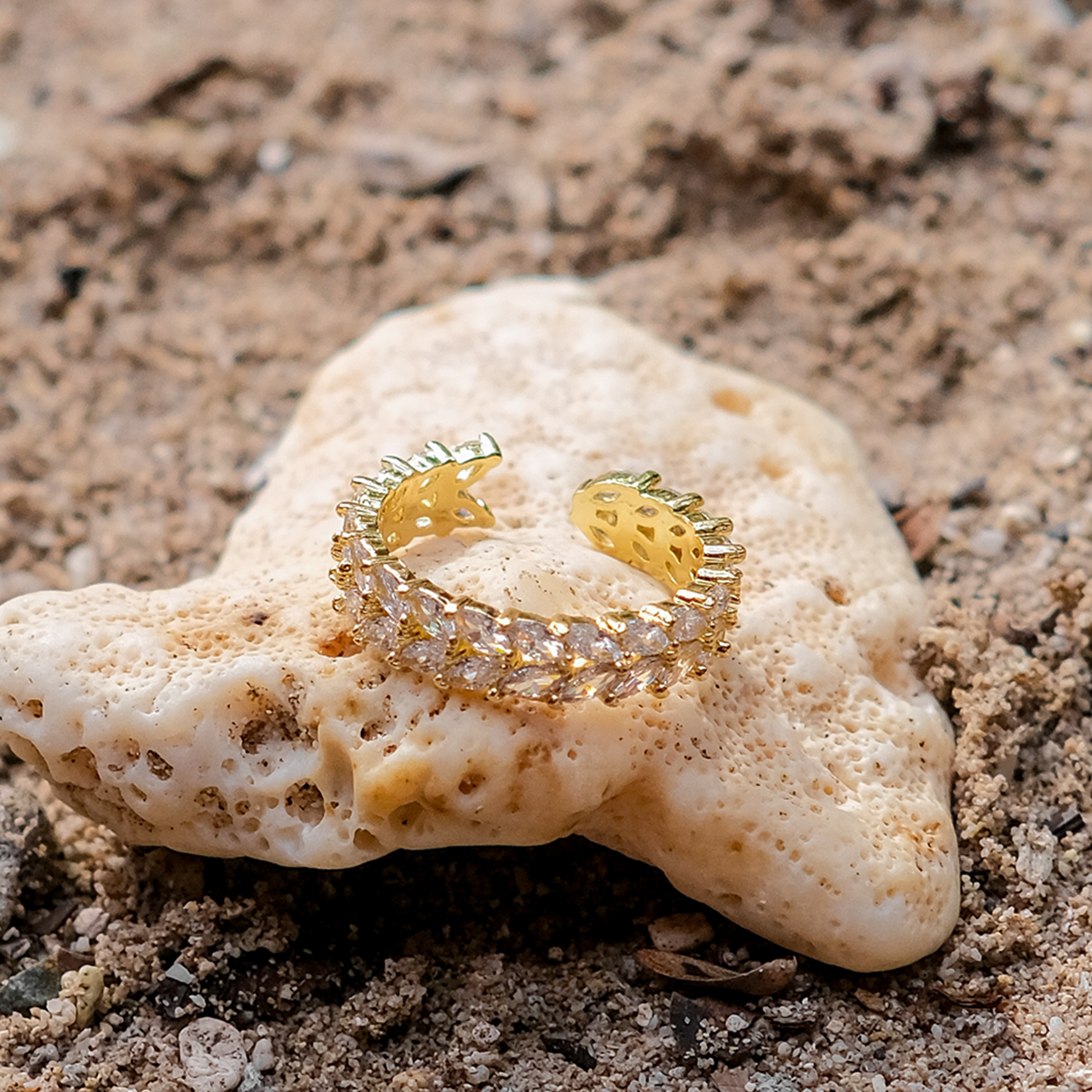 Ameriel is a stylish and sophisticated piece of jewelry that adds a touch of glamour to your look. It features a gold band with an open-ended design embedded with diamond simulants that sparkle like diamonds.