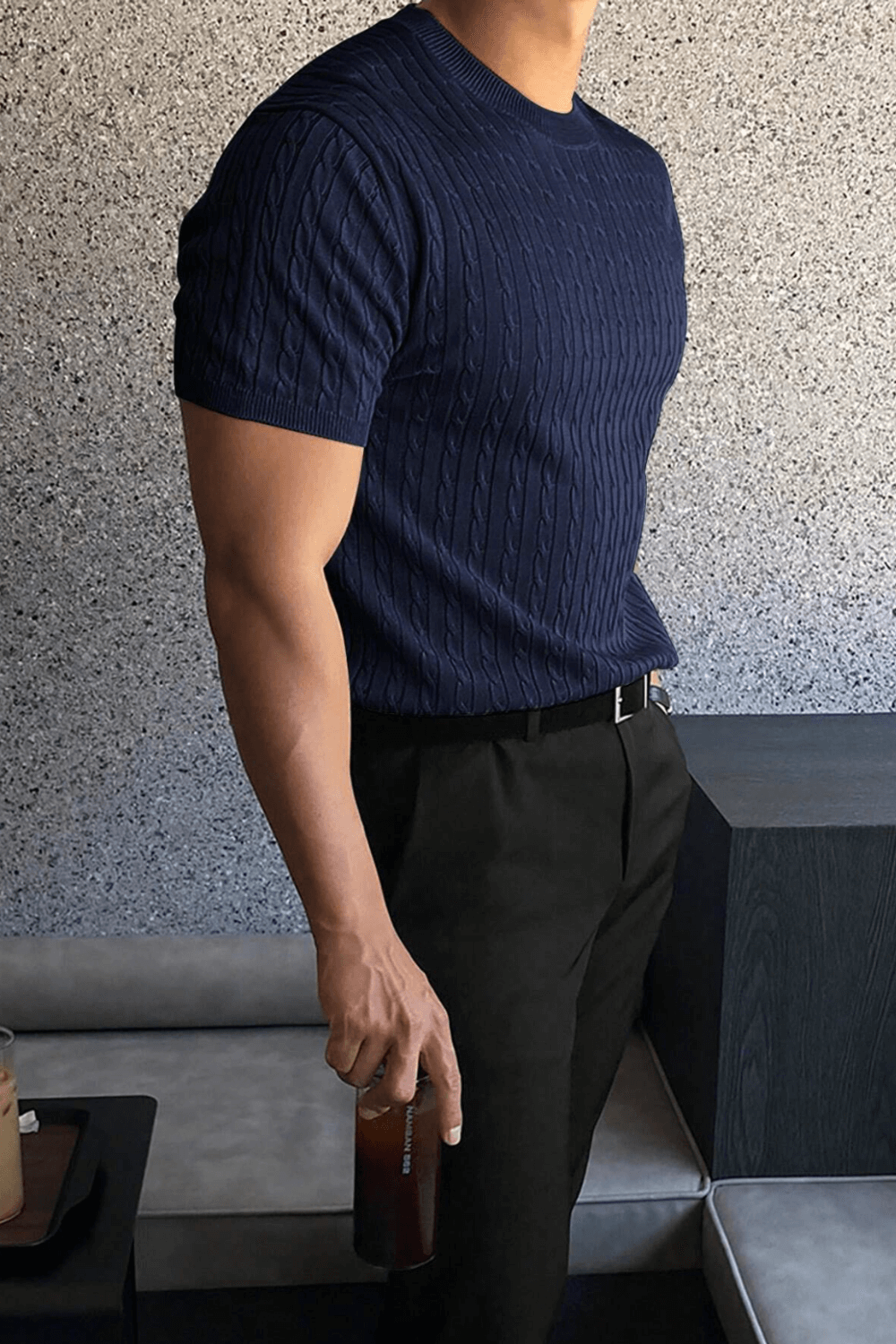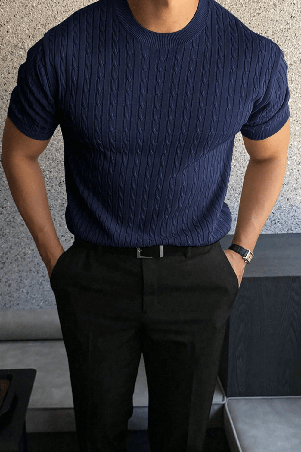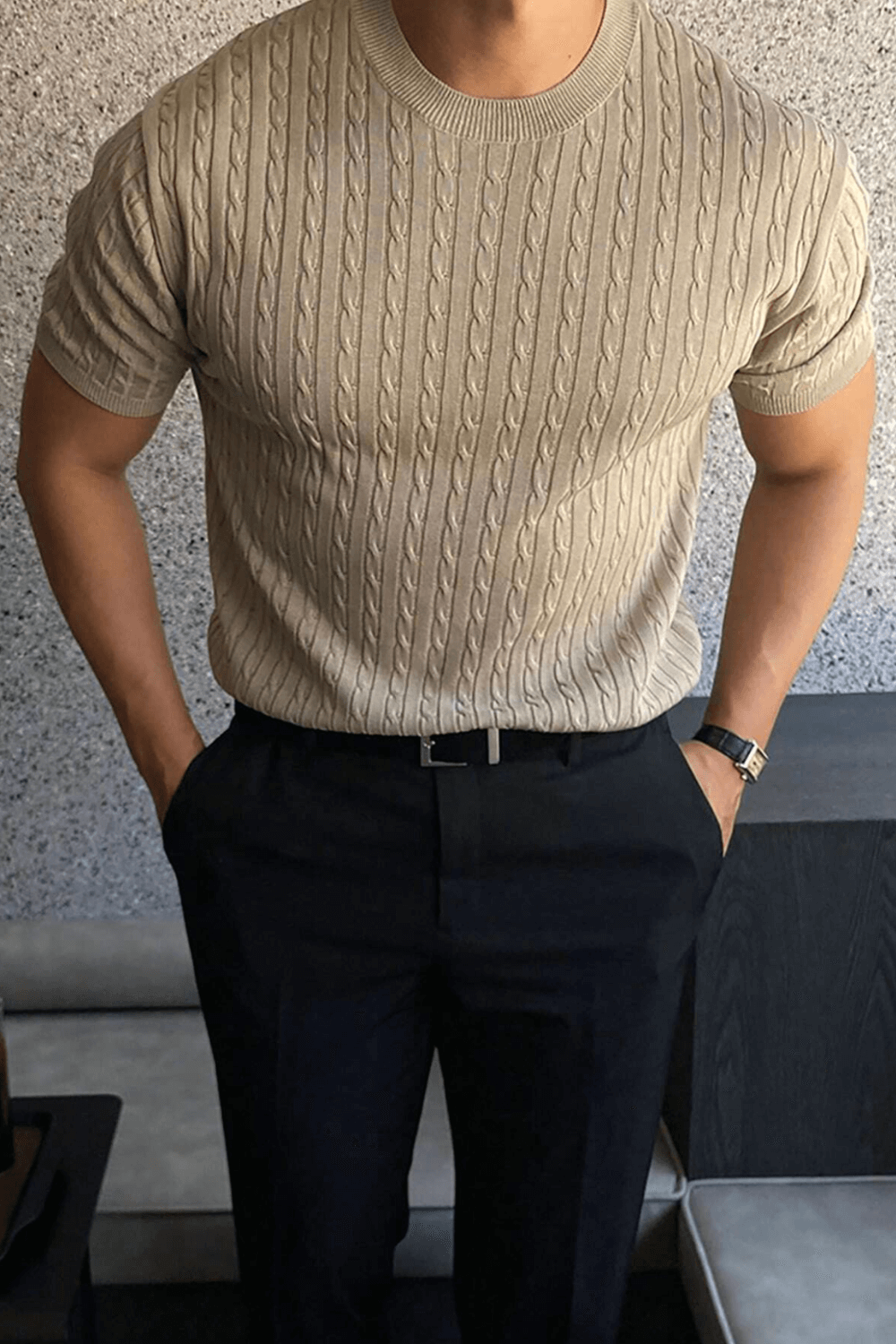This men's round-neck short sleeve knit top offers a comfortable, elegant fit for everyday wear. Made from soft, breathable fabric, it's perfect for layering or wearing on its own.