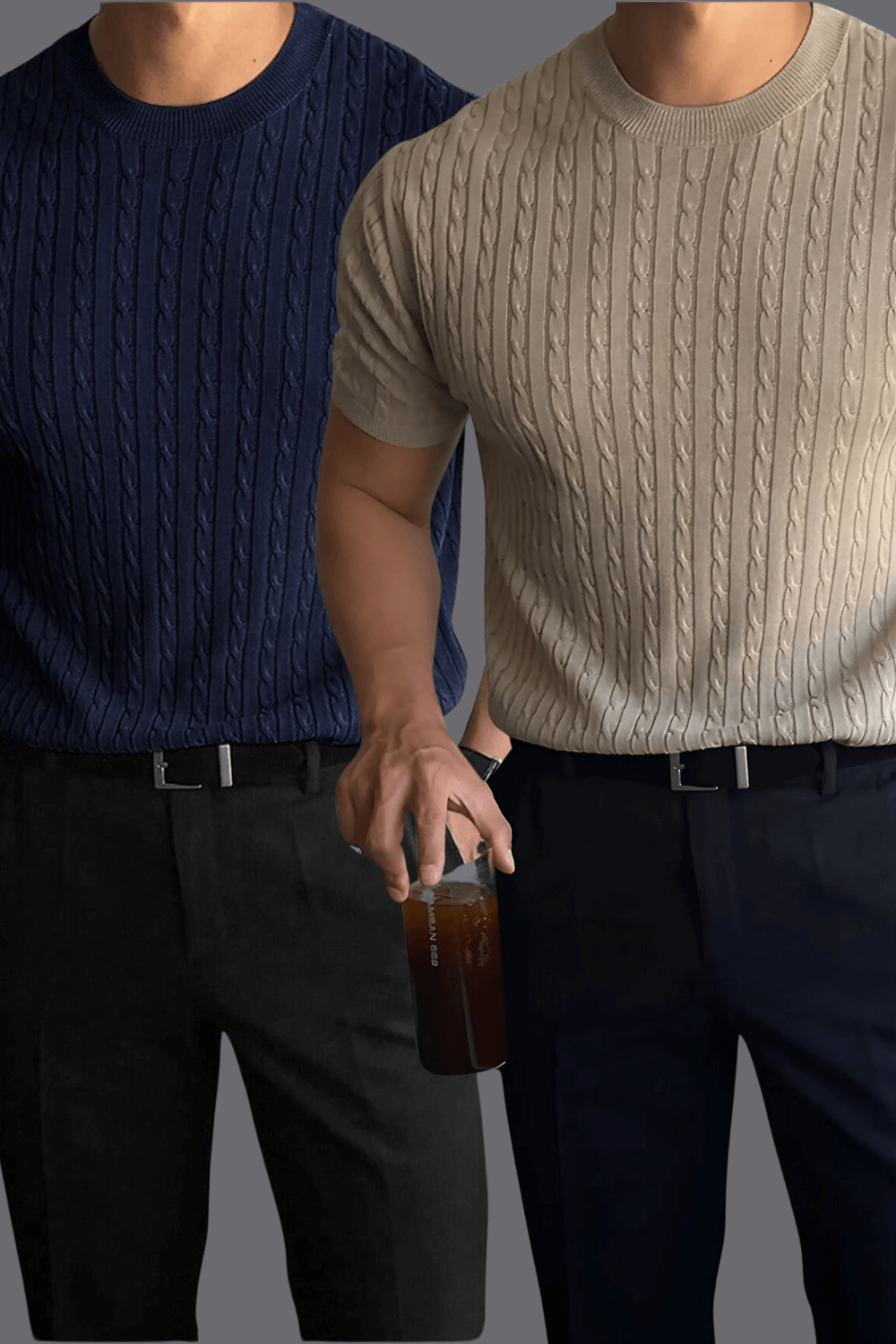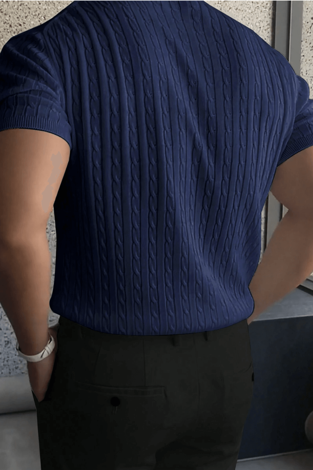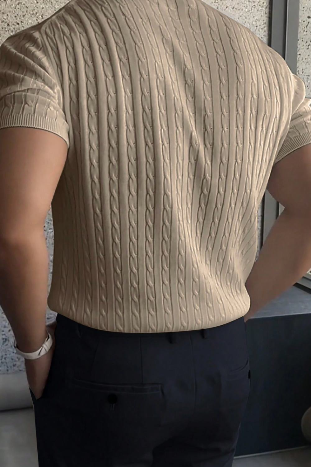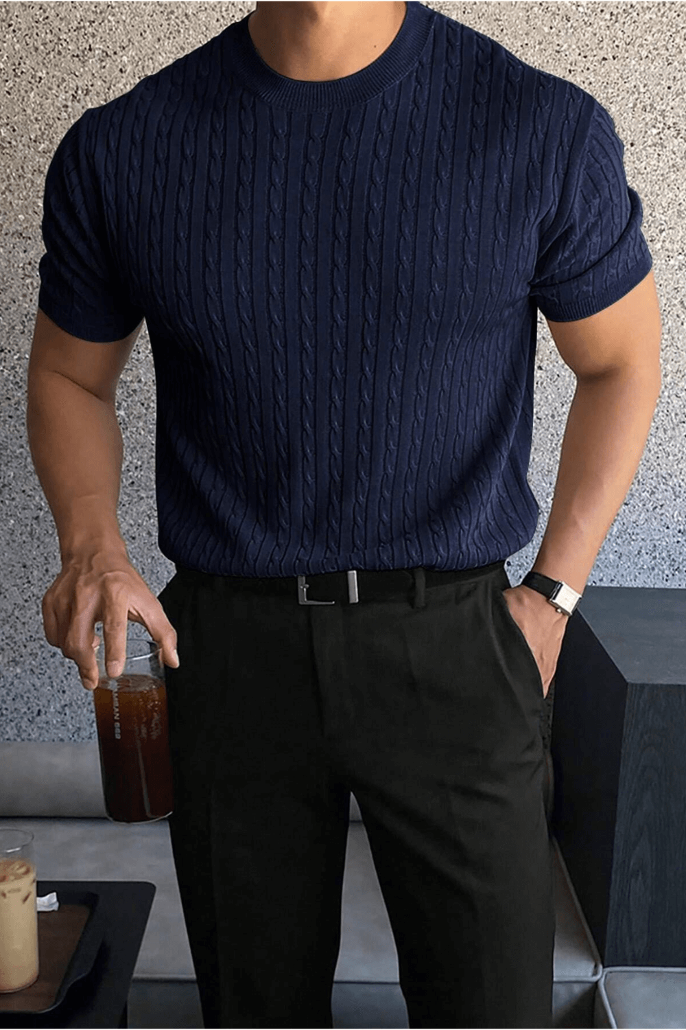 This men's round-neck short sleeve knit top offers a comfortable, elegant fit for everyday wear. Made from soft, breathable fabric, it's perfect for layering or wearing on its own.