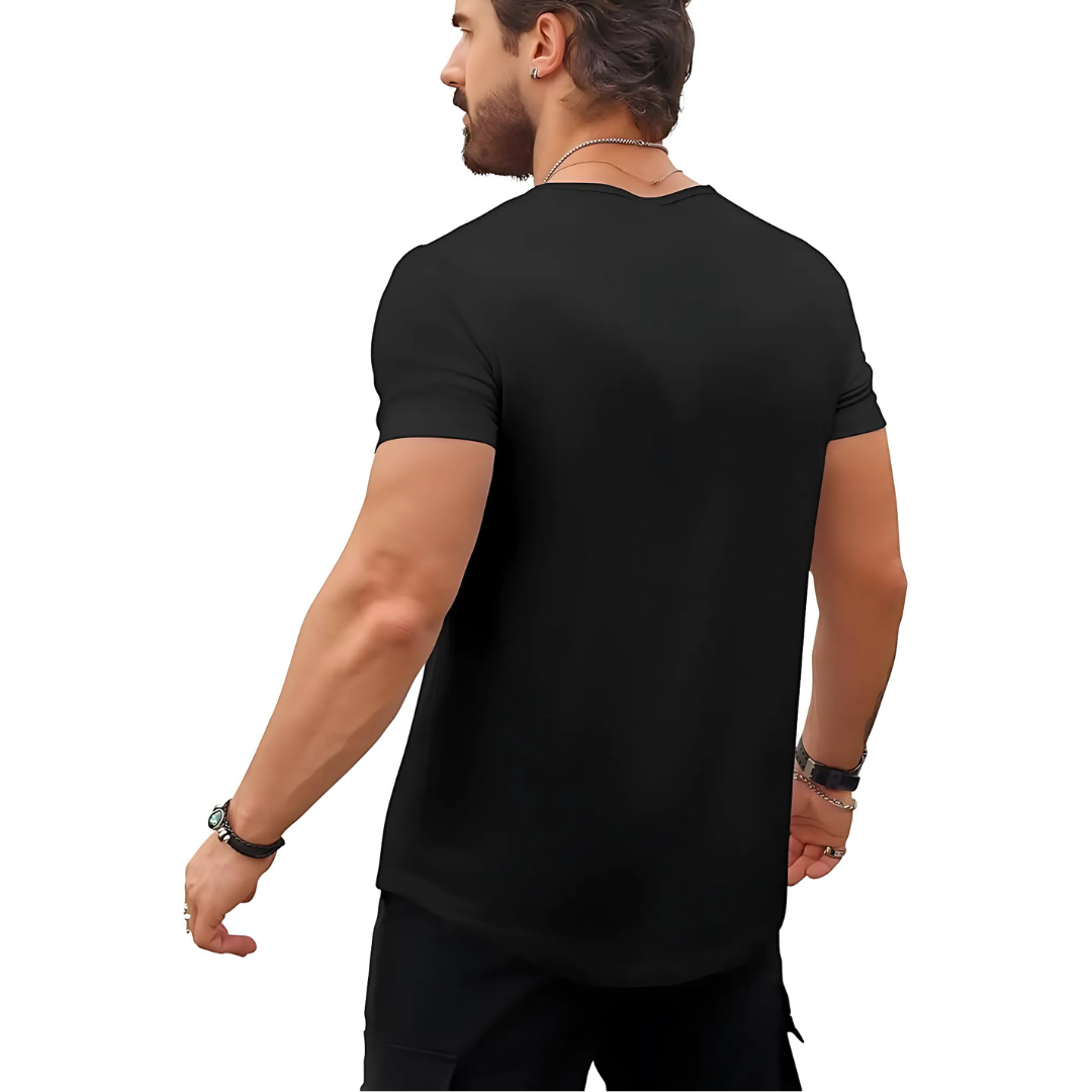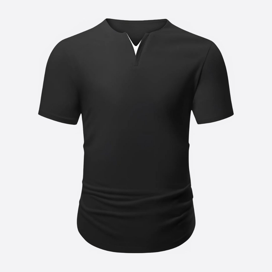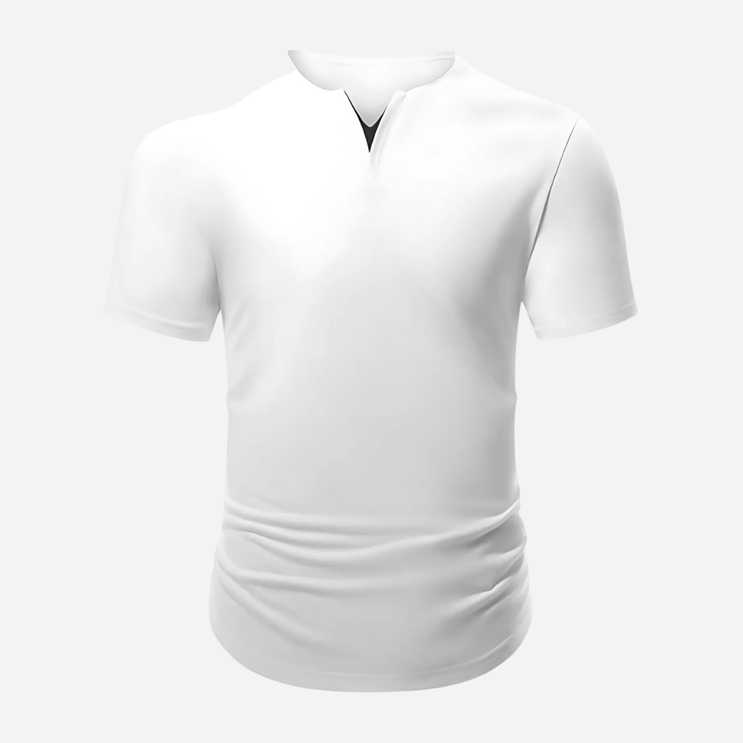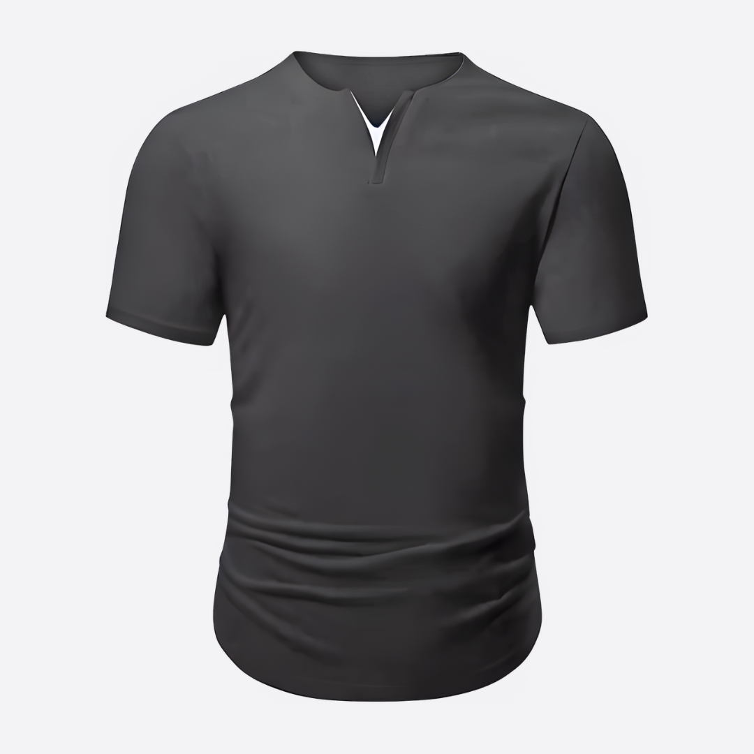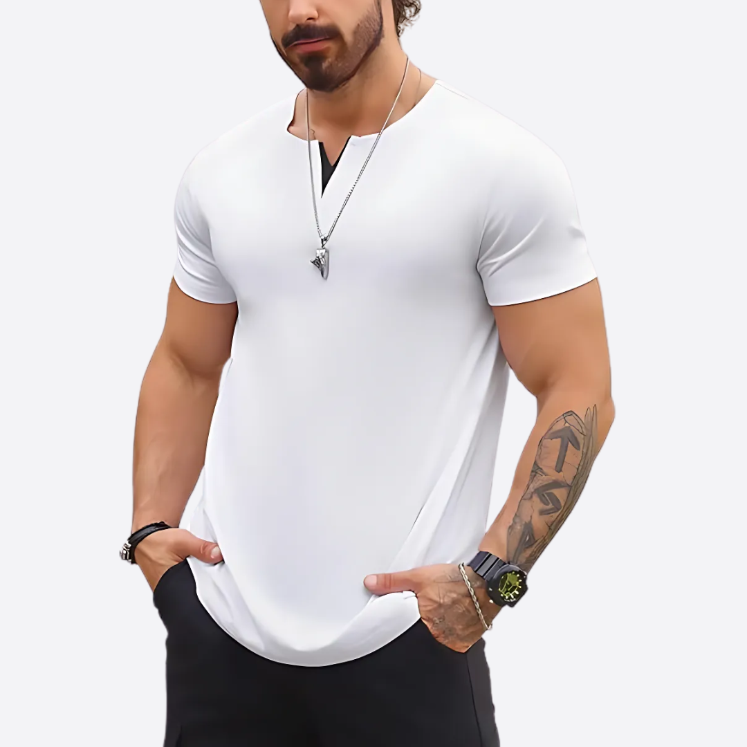 This muscle-fitted shirt features a dual V-neck design, providing a sporty yet relaxed fit that stretches and highlights your physique.